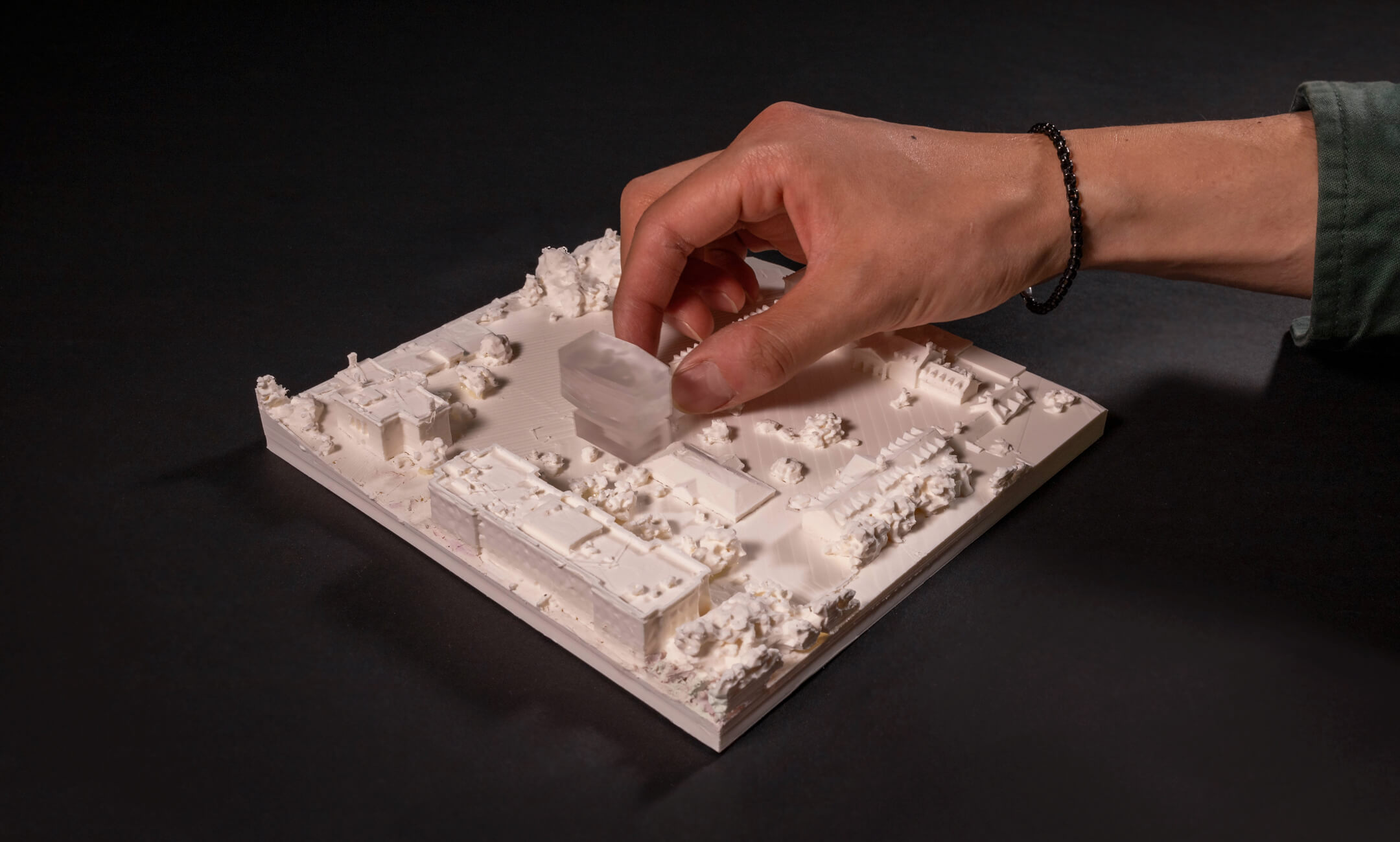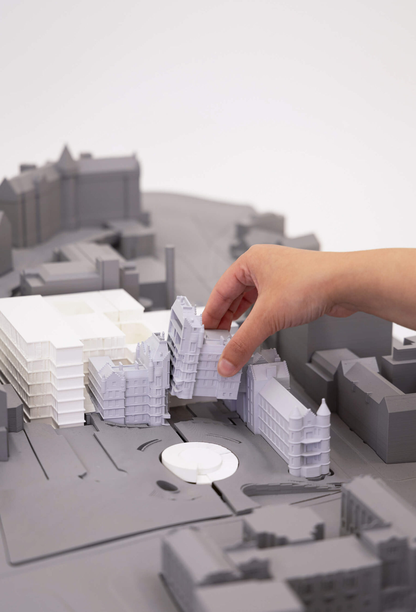 At the Schematic Design stage, a 1:500 site and massing model was developed for internal team use and subsequently adapted for client presentations. Constructed with a laser-cut millboard site base, the model incorporated interchangeable building volumes, allowing the team to test and compare massing strategies swiftly. Primarily 3D-printed in Polylactic Acid (PLA) and resin, the building forms could easily be exchanged, allowing for rapid exploration while communicating the implications of each option. This flexible approach transformed the model into a collaborative tool, aligning the client and design team through a shared, tangible understanding of shared vision through scale, form, and spatial impact.