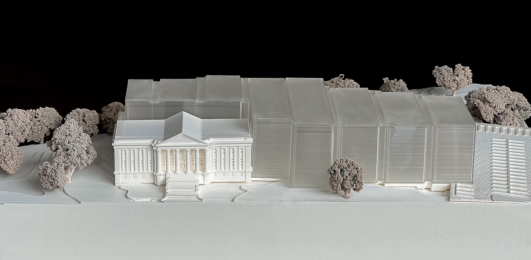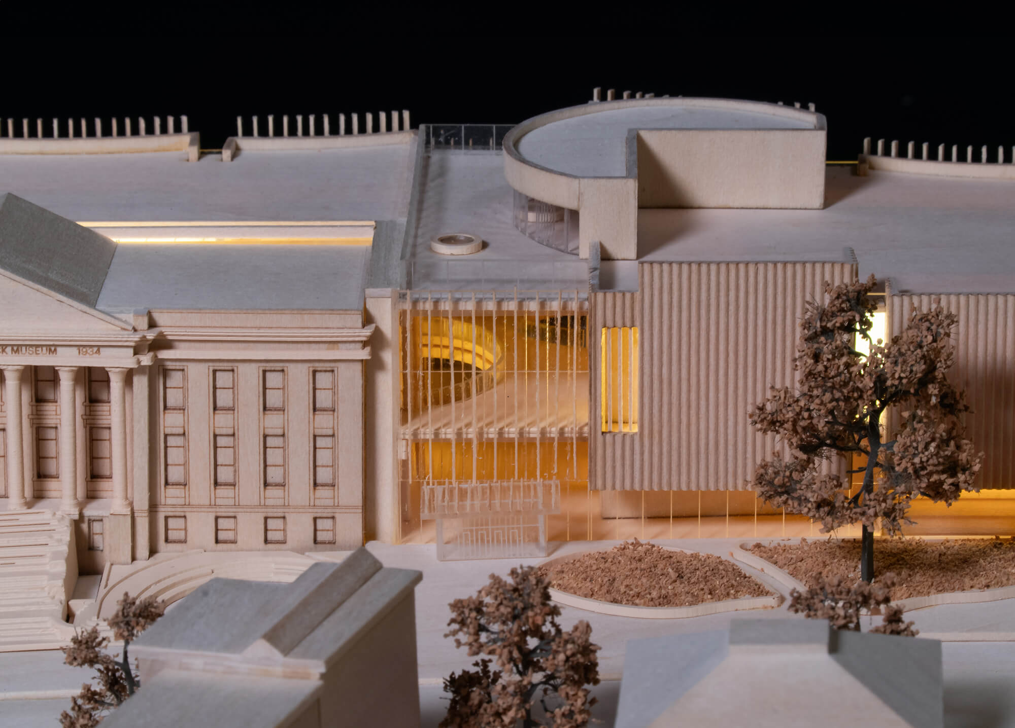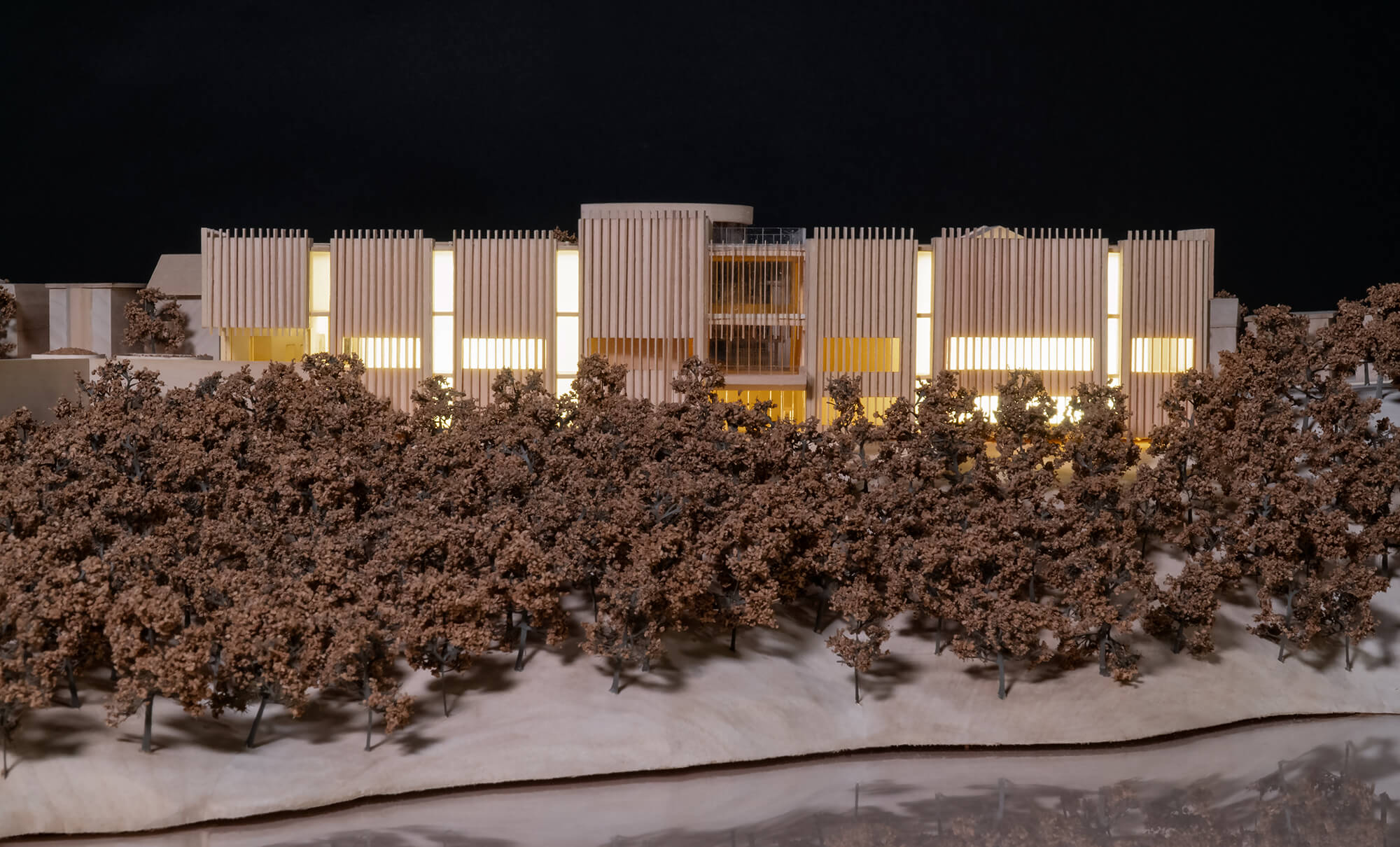 The third and final model, produced by JS Models, was a highly refined and presentation-ready spatial, volumetric, and textural representation of the proposed design. It details the cladding systems on both the building’s primary façades, clearly articulates the project’s glazing strategies, and shows the interconnecting spaces within the lobby. Site context was a key component of the model, which includes surrounding residential buildings and the densely treed landscape, offering a sense of the museum’s scale within its broader location and surroundings. Additionally, interior illumination convey atmosphere and transparency. This iteration was displayed at a City Council presentation in support of the project’s rezoning application to communicate the project vision and intent and was subsequently approved.