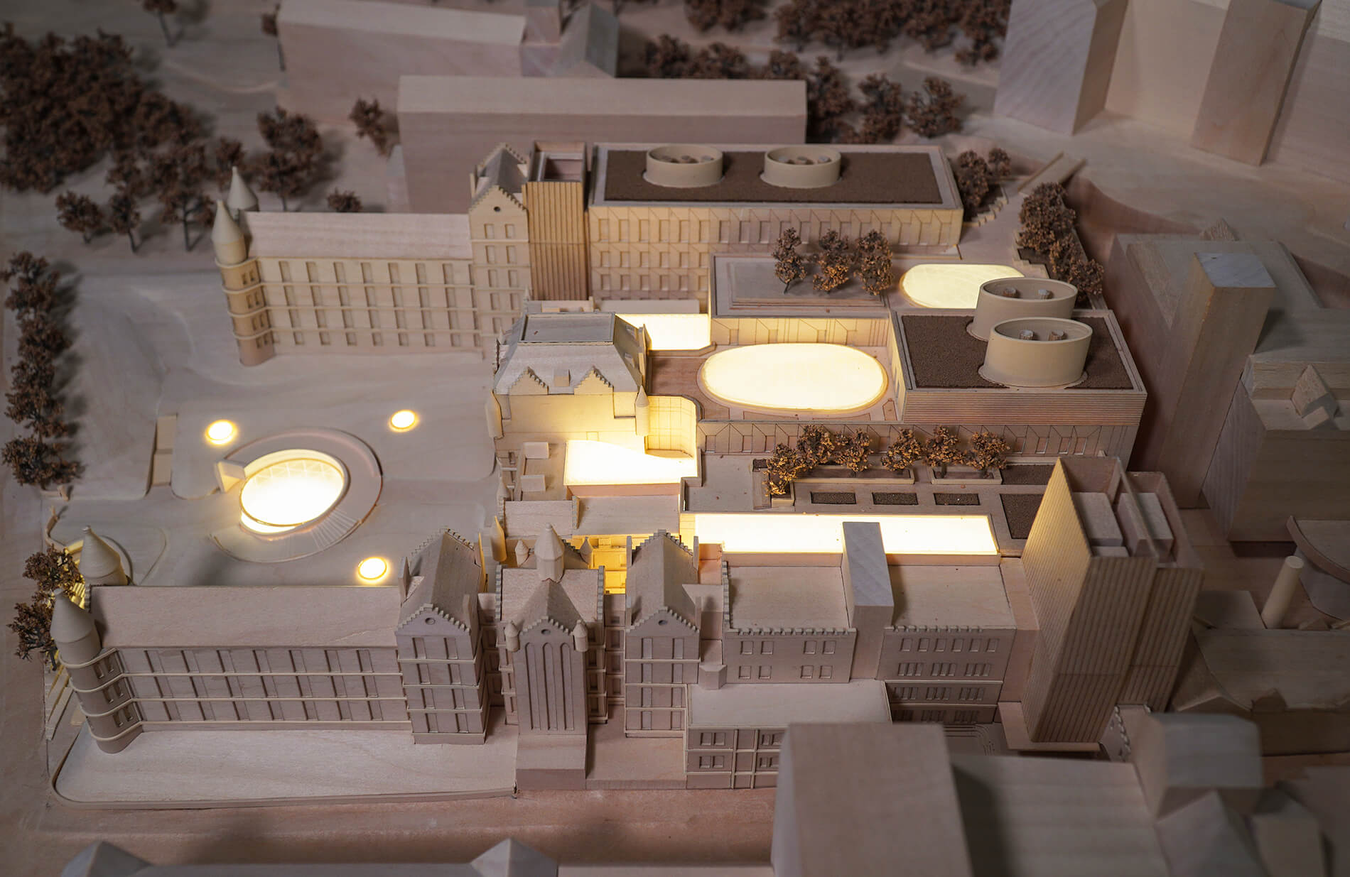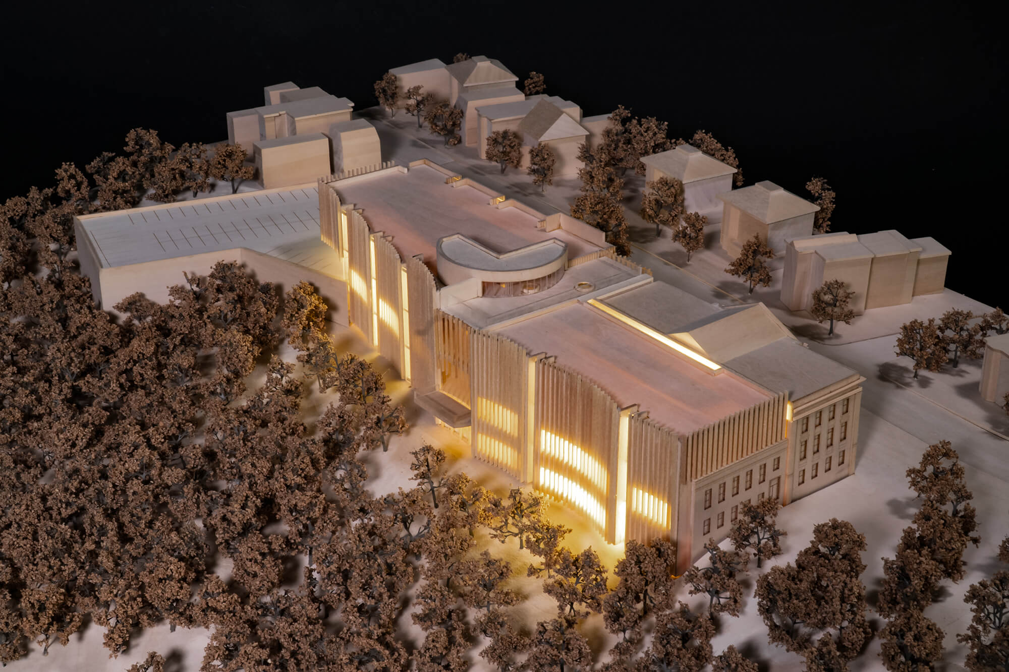As the design evolved, a refined presentation model was commissioned to support public outreach and fundraising efforts. Produced in collaboration with JS Models, the model translated the technical studies into a warm, legible, and highly crafted object. A wood-clad base established the campus context, while the building façades were rendered in wood veneer. The use of wood for both the existing context and the proposed design illustrated the intent to build into an existing, well-defined historical campus. Plexiglass glazing articulated transparency and key public spaces and selectively illuminated 3D-printed skylights highlighted interior gathering areas and circulation zones—creating an informative representation of the future campus.