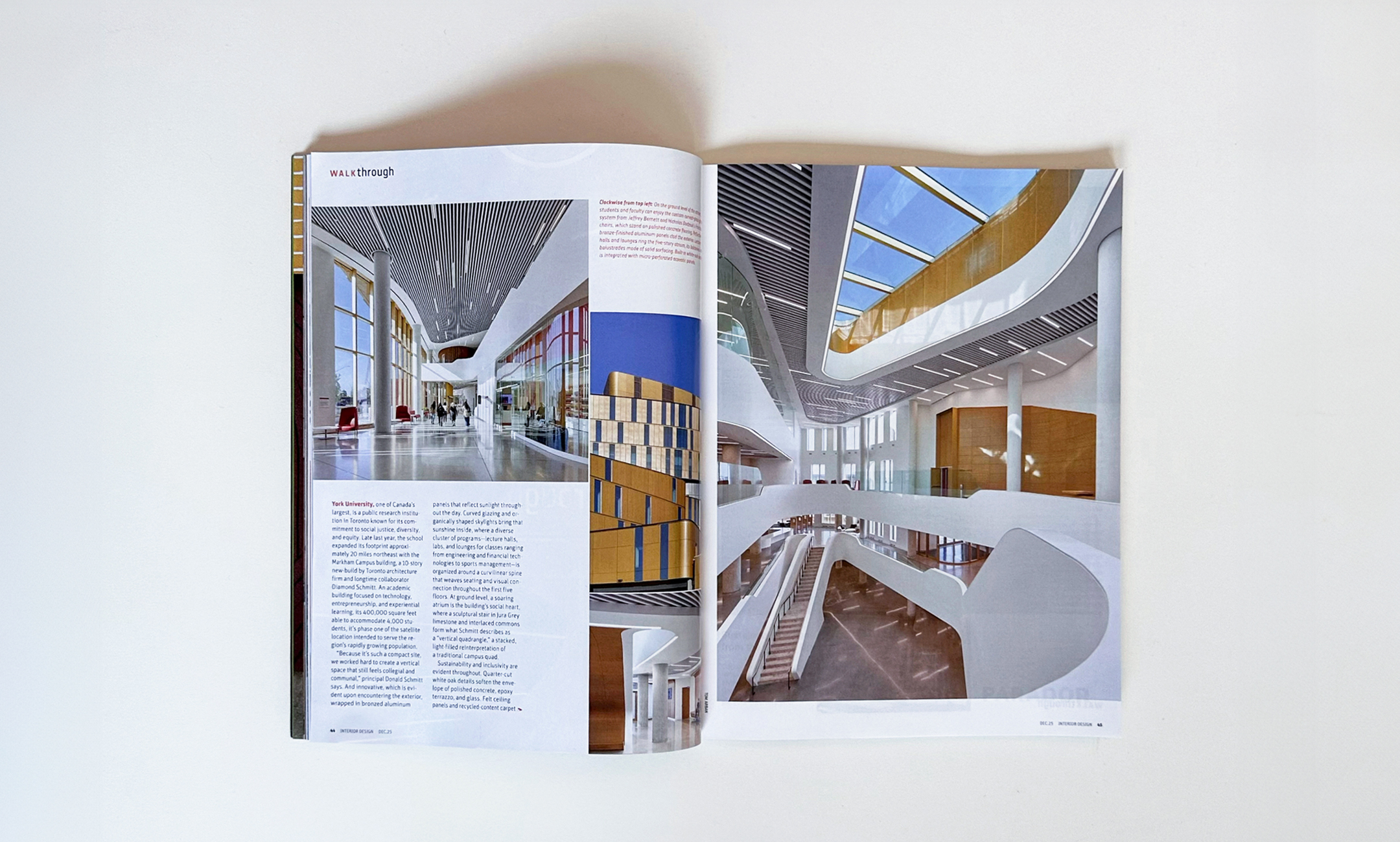 York University Markham Campus is featured in Interior Design magazine’s Walkthrough section in an article by Lauren Jones that highlights the project’s innovative response to a compact site, its sustainability performance, and its role in shaping an inclusive academic environment that encourages interaction and connection.