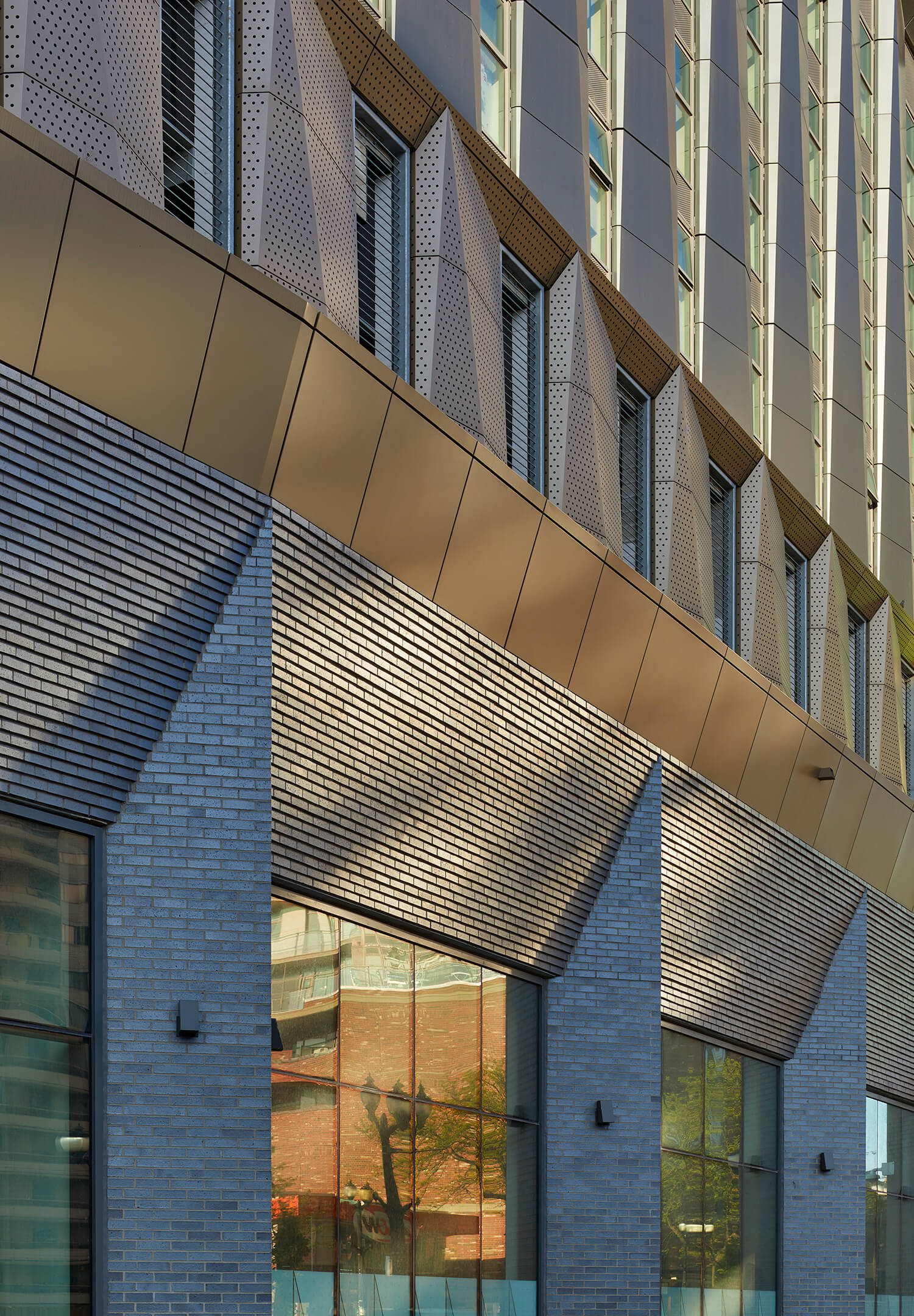 Responding to the surrounding urban architecture, the building’s exterior draws inspiration from the neighbouring Hamilton City Hall’s chevron floorplate. A combination of glazing and angular, dimensional cladding begins at the podium level and extends vertically across all façades. Continuity of this angular language permeates the interior podium and is expressed through canted suspended ceiling planes, custom feature millwork elements, and a cohesive internal signage and wayfinding strategy.