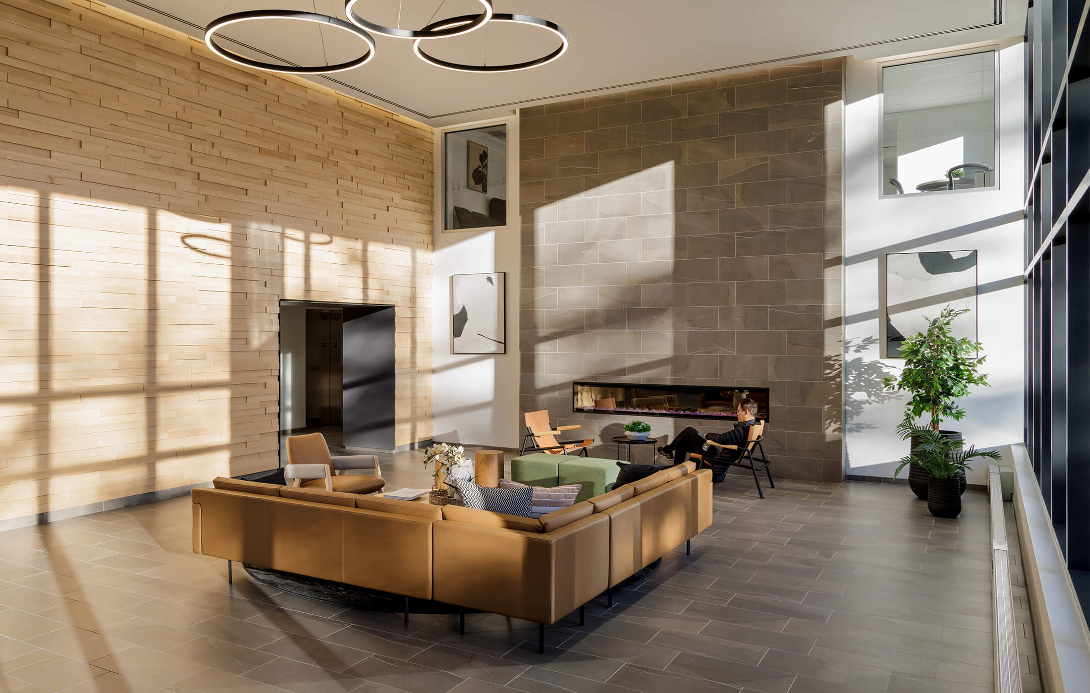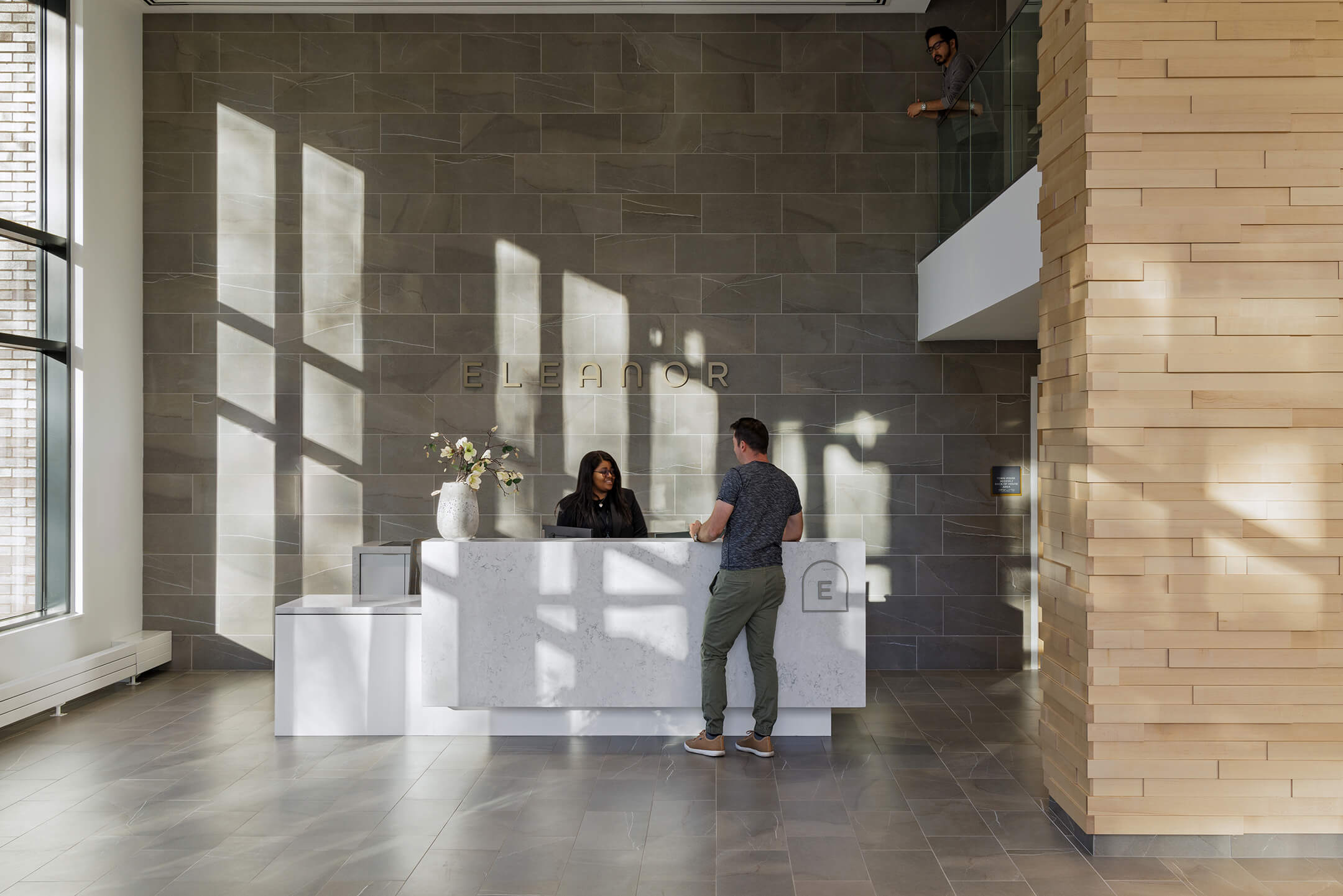 Serving a broader demographic—including both students and young professionals—Eleanor, the market rental building, introduces 260 units in a mix of 1- and 2-bedroom apartments and 12 three-bedroom townhomes. Shared amenities are designed for comfort and convenience. A welcoming lobby featuring rich interior design materials offers a concierge and 24-hour security for residents. At the heart of the building, a large outdoor terrace and winter garden provide year-round spaces for residents to gather and relax.