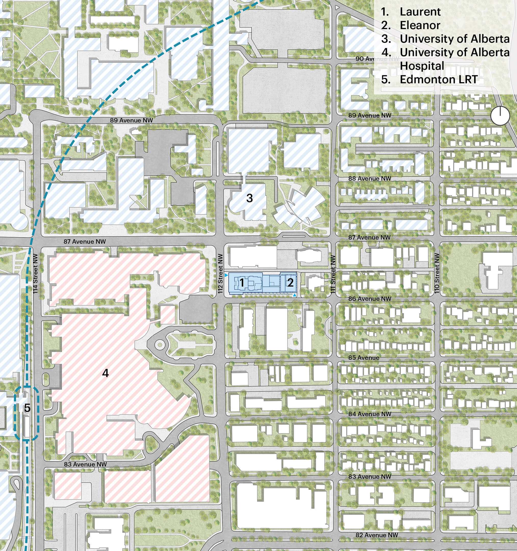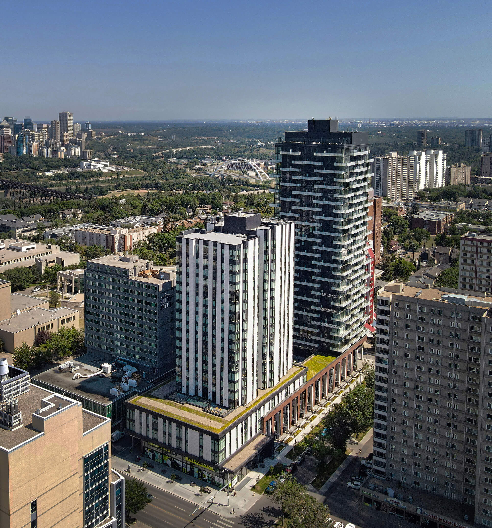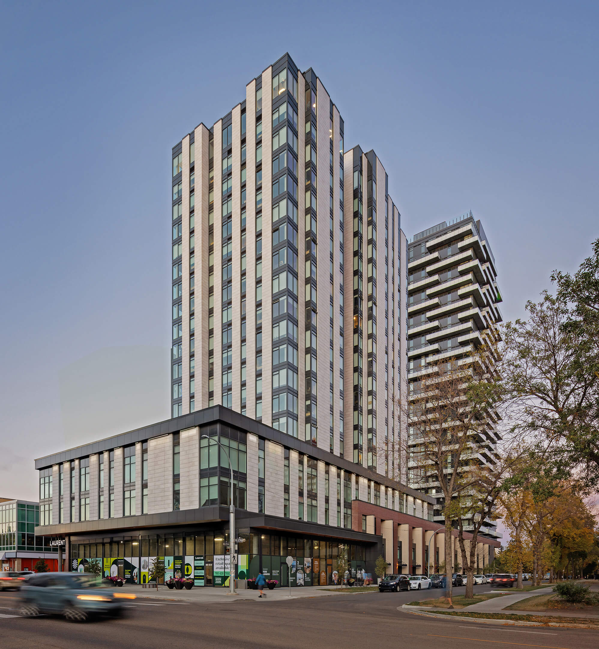 The project includes two residential towers: Laurent, dedicated to student housing, and Eleanor, offering market rentals—anchored by 7,000 square feet of commercial retail space along the active corridor of 112 Street NW.